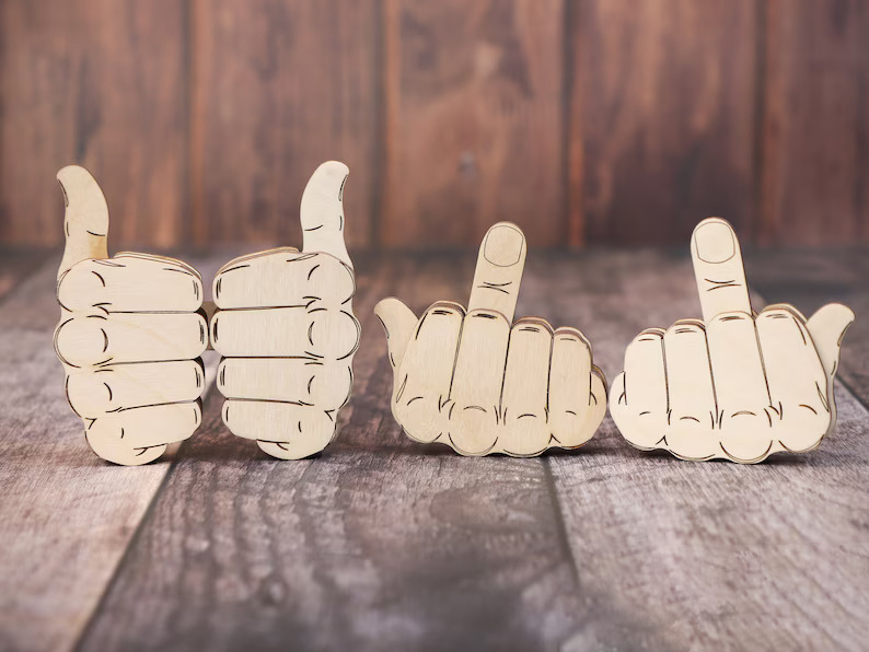 Bold & Funny Design: A carved wooden hand gesture that instantly grabs attention and adds humor to any space.
