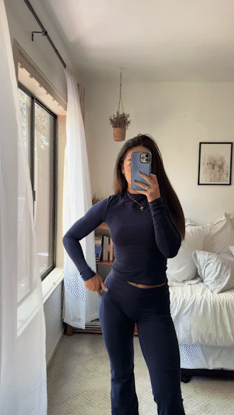 A fitted round neck T-shirt paired with stretchy casual pants, which is super flattering!