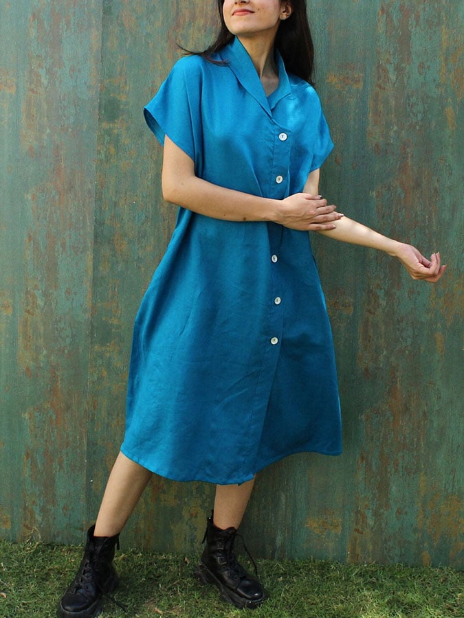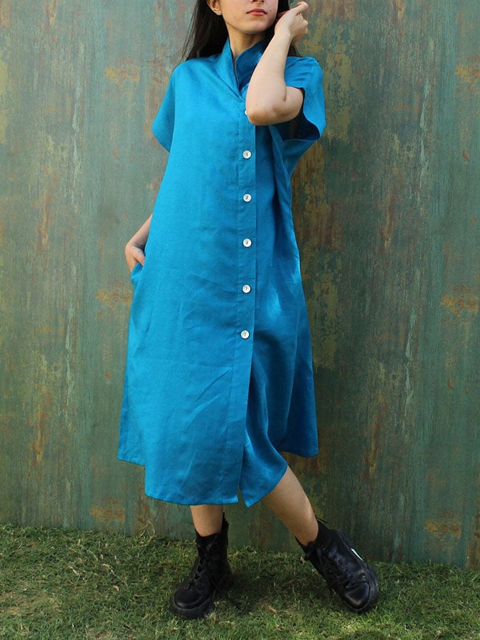 Ladies Casual Solid Color Cotton And Linen Lapel Dress