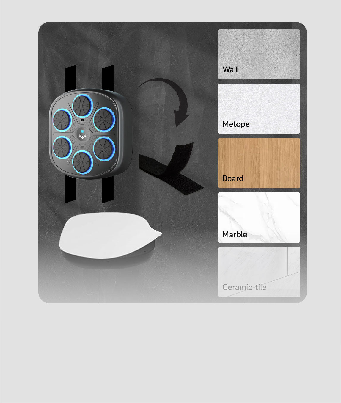 No drilling required. Allow to be mounted on the wall with Velcro; height adjustable.